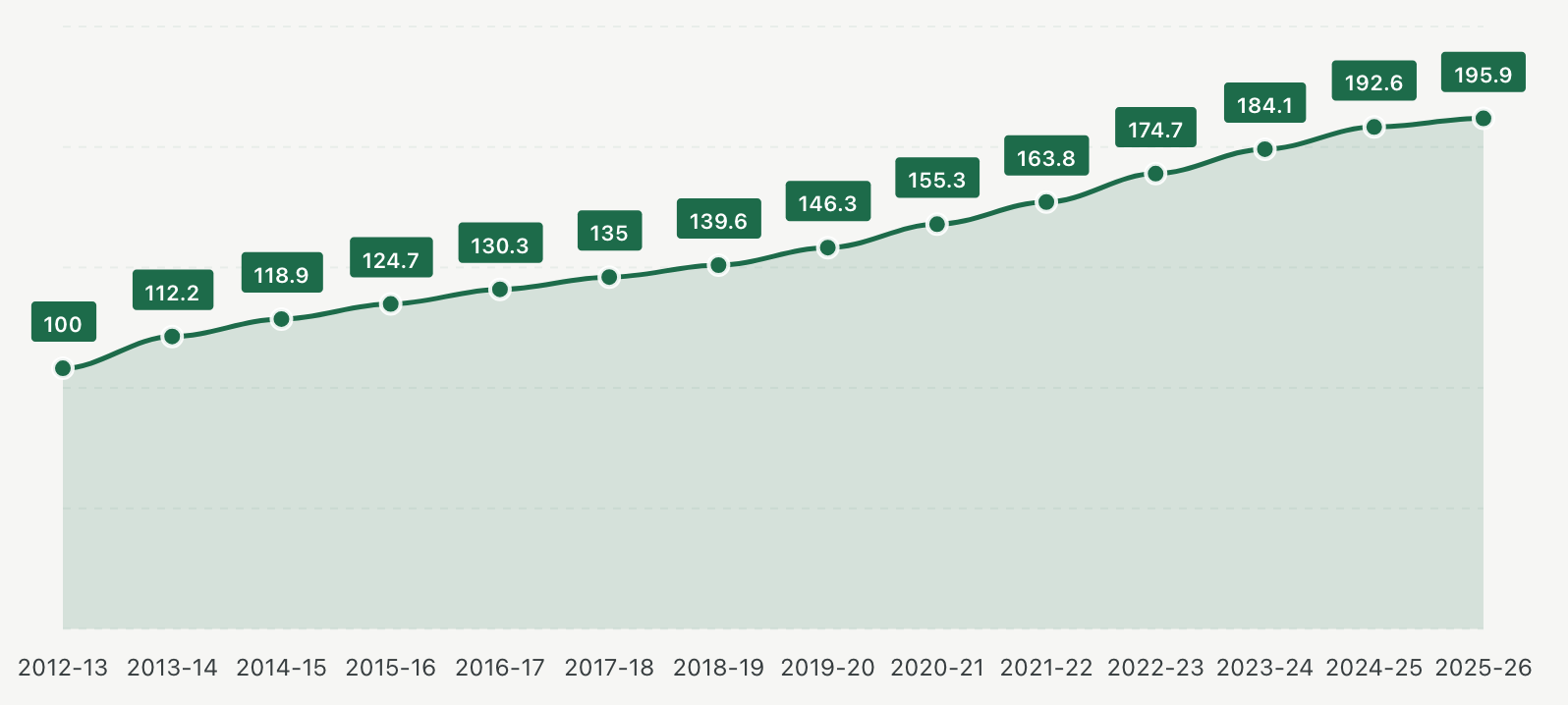 The Consumer Price Index shows that compared to 2012, the prices of goods and services have almost doubled in 2026.